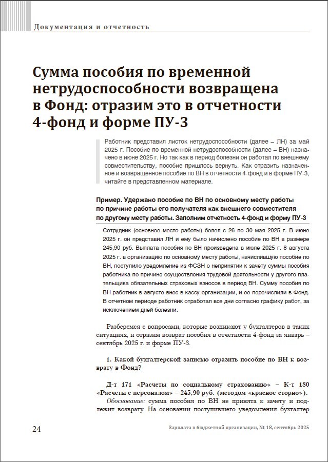 Сумма пособия по временной нетрудоспособности возвращена в Фонд: отразим это в отчетности 4-фонд и форме ПУ-3